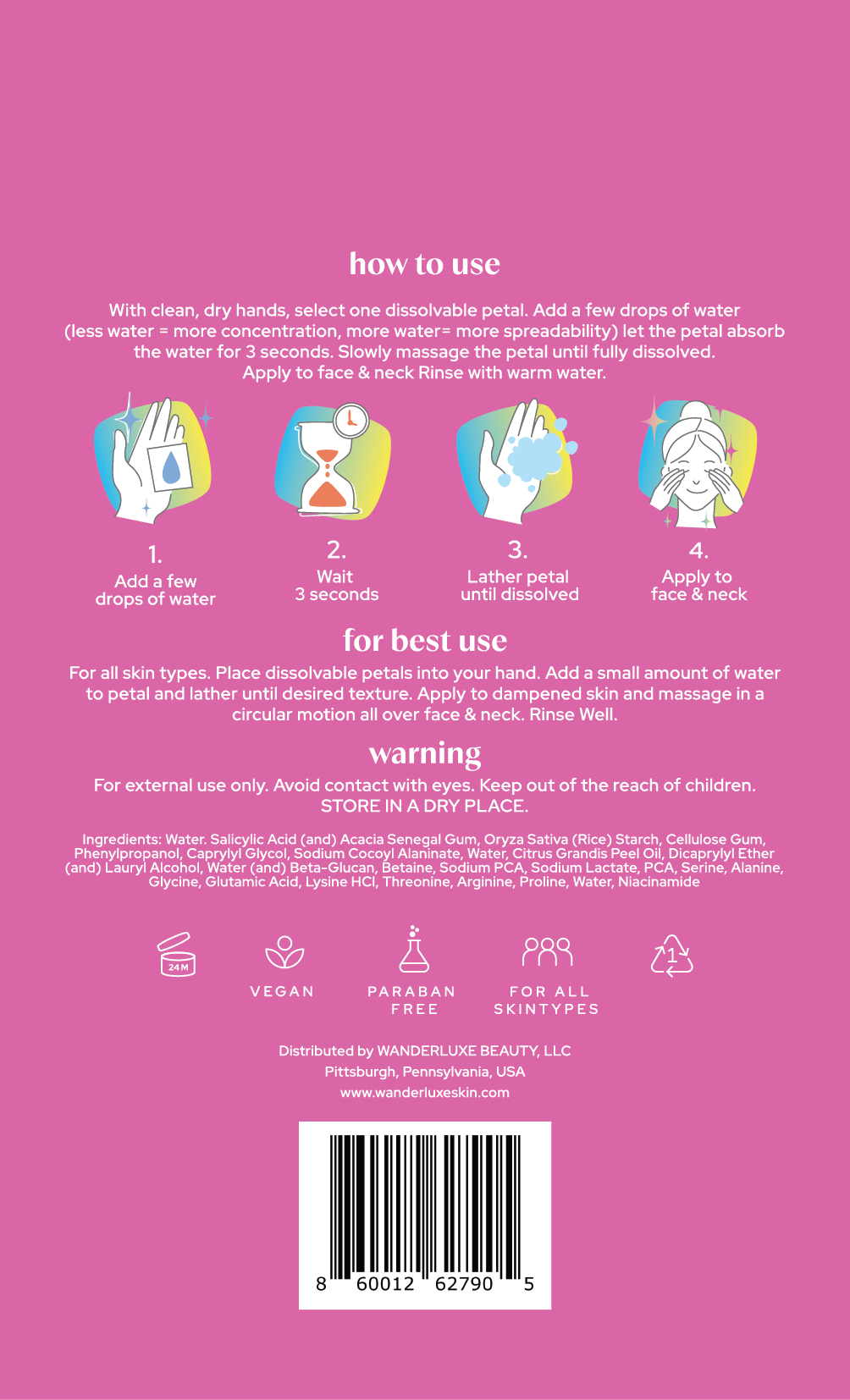 At wanderluxe we believe in the power of clean, effective beauty products. Our dissolvable skincare system is meticulously formulated to cater to all skin types, including sensitive and problematic skin. We prioritize using only the highest quality, non-toxic ingredients that deliver impactful results without compromising on safety. Each product in our line is designed to dissolve effortlessly into your skin, providing deep nourishment and hydration while maintaining a gentle touch. Whether you're dealing with dryness, acne, or sensitivity, our innovative approach ensures that your skin receives the care it deserves, leaving you with a healthy, radiant complexion.